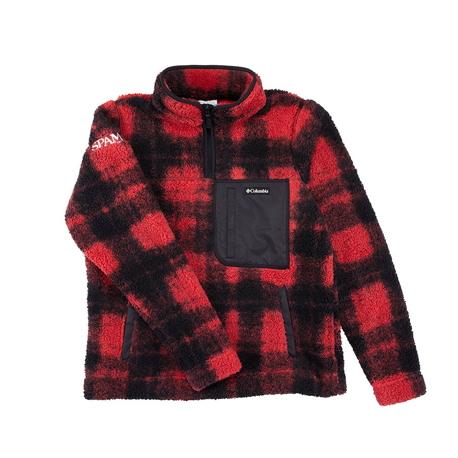 G6410 - Adventure-ready and undeniably cozy, this SPAM® brand Columbia fleece pullover brings rugged charm and comfort together. Featuring a classic red-and-black plaid pattern, zip-up chest pocket, and subtle SPAM® logo on the sleeve, this soft sherpa fleece is built for chilly days and canned-meat lovers alike. Cropped, ladies sizes S-XXL.