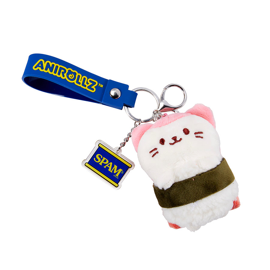 #G6042 Carry a bite-sized buddy with you wherever you go with these adorable Anirollz plush animal musubi keychains! Choose your favorite from a sweet puppy, a playful kitty, or a charming chick, each rolled up in soft rice and a nori seaweed wrap, just like a delicious SPAM® musubi. Each keychain also features a bright blue "ANIROLLZ" strap and a mini SPAM® brand logo charm for an extra touch of fun. These delightful keychains are the perfect way to show off your love for cute critters and the iconic SPAM® Brand!